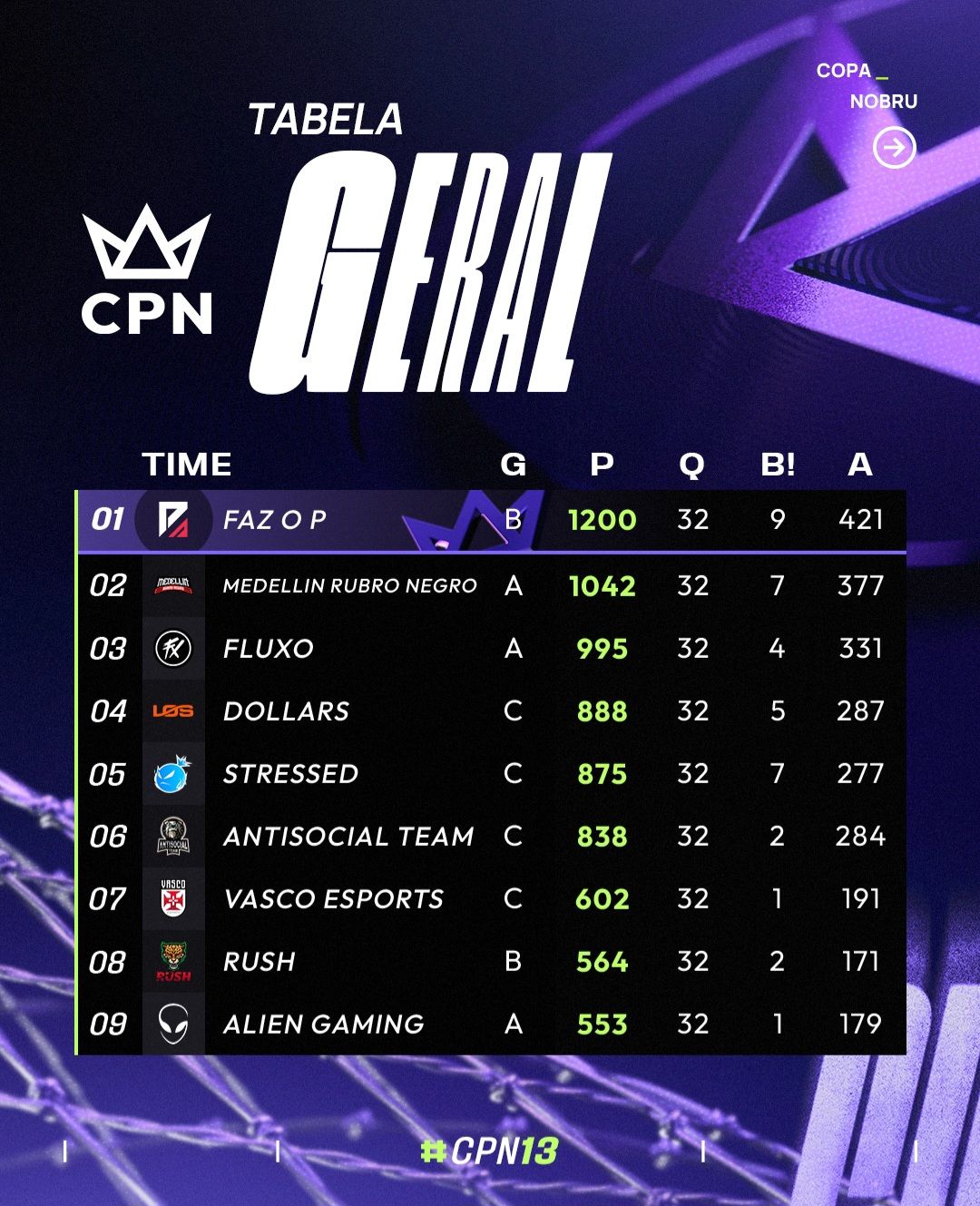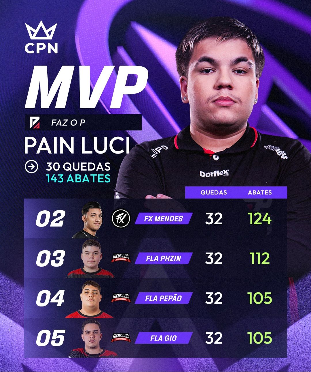 Na corrida pelo título de MVP, o destaque é Luci (Faz o P), com 30 quedas e 143 abates, seguido por Mendes (Fluxo) com 124 abates e PHzin (Medellin) com 112. Luci já é considerado um dos nomes mais consistentes do cenário competitivo e sua performance na CPN 13 reforça sua reputação como um dos jogadores mais dominantes da atualidade.