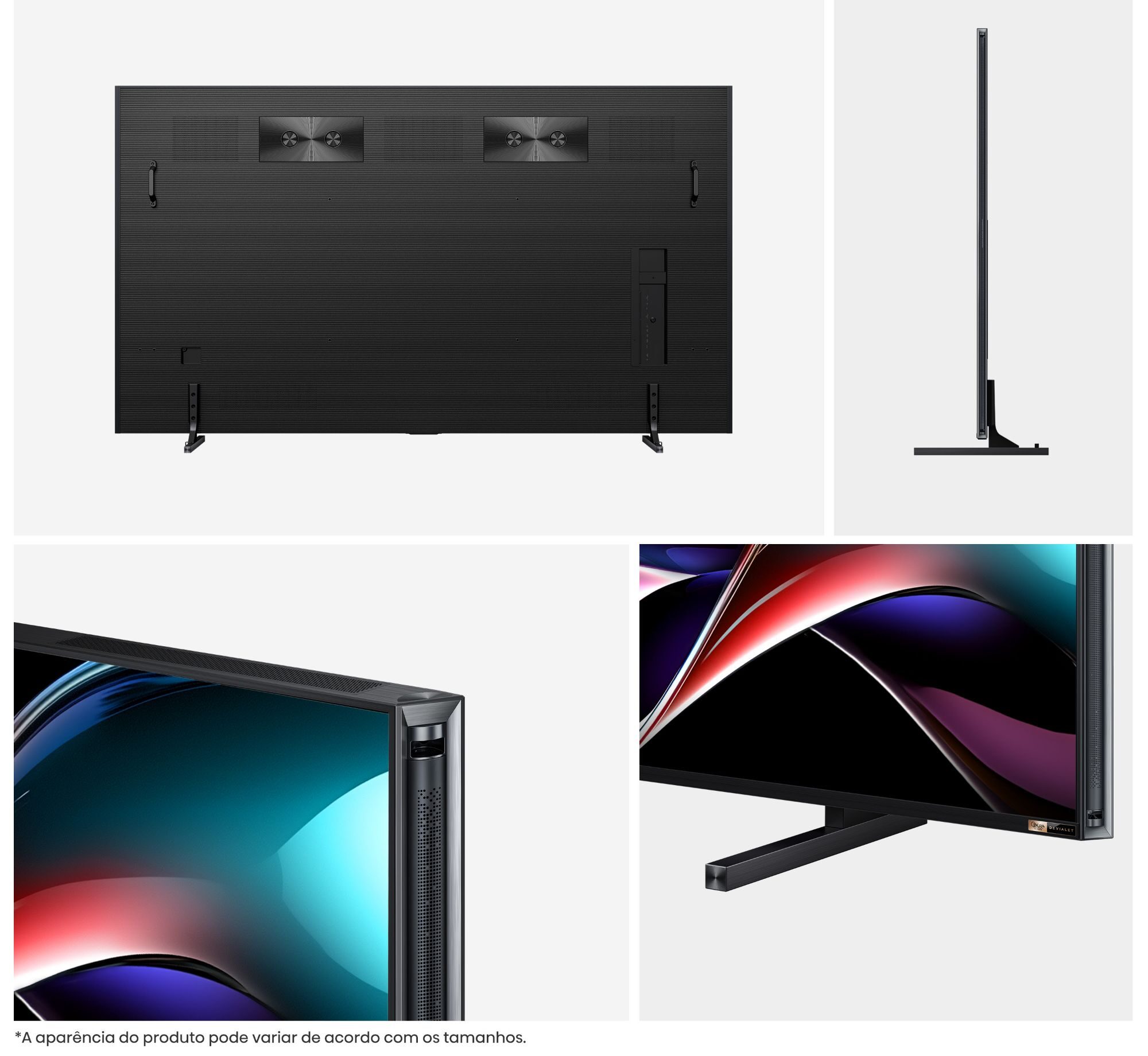 O design também impressiona: a estrutura Infinity Vision de 116” elimina bordas visíveis e utiliza suporte duplo em metal puro, reforçando a proposta de imersão total.
