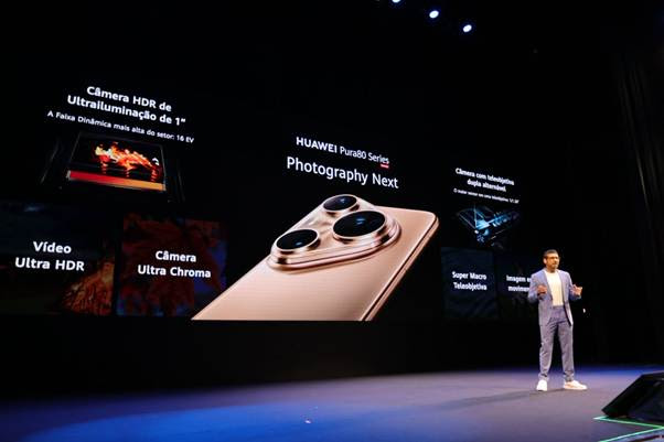 Durante o evento, a empresa destacou a linha HUAWEI Pura 80, que traz câmeras de alto desempenho e design inspirado na natureza. Segundo a fabricante, os sensores aprimorados e o uso de inteligência artificial garantem maior precisão e qualidade de imagem.