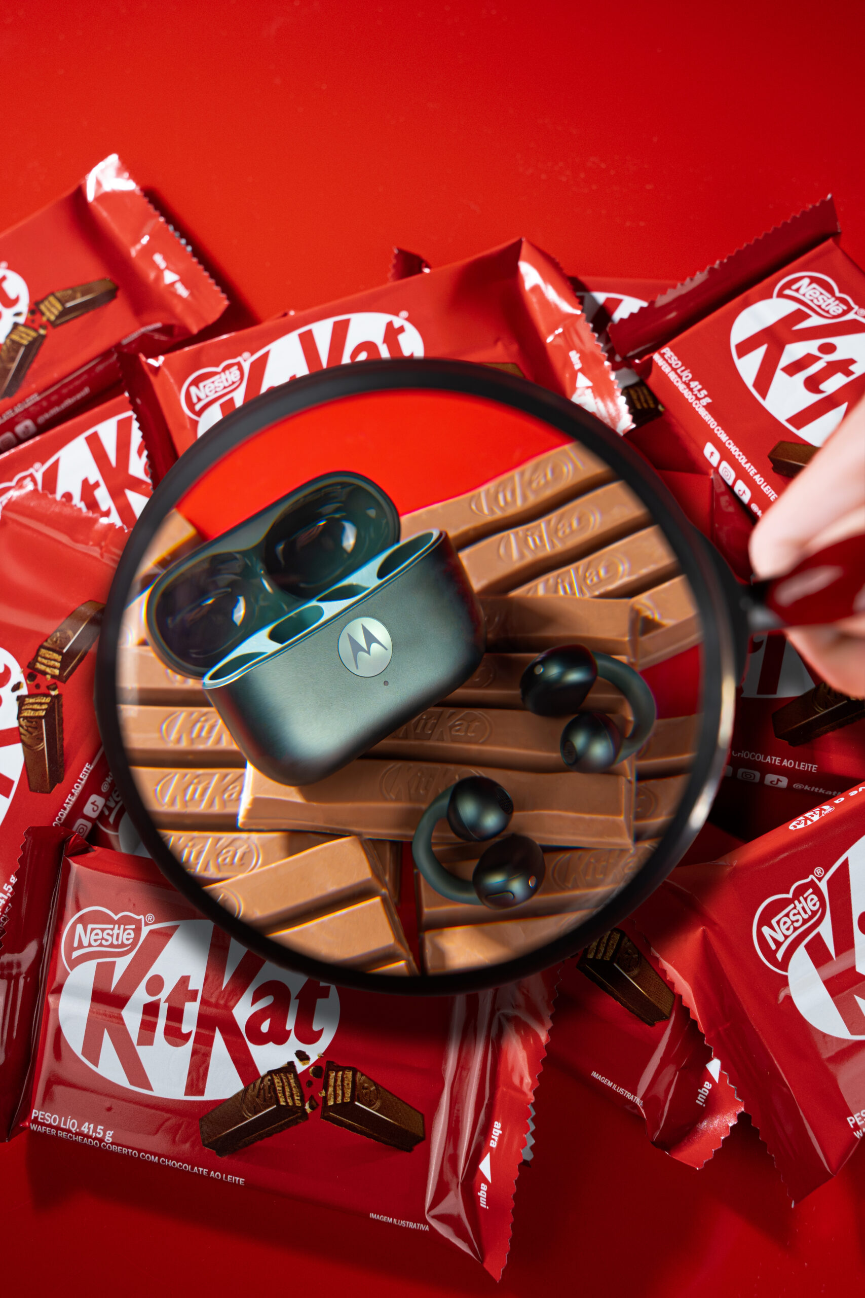 A collab inclui um kit personalizado que combina os fones de ouvido moto buds loop e uma edição especial do moto watch fit, ambos com design exclusivo e aroma de chocolate desenvolvido pela Firmenich — o mesmo parceiro responsável pelas fragrâncias das linhas premium da Motorola.