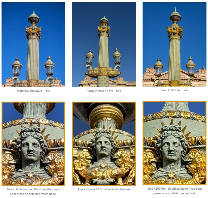 Na categoria de zoom, o modelo registrou 135 de 159 pontos, com nota específica de 153 de 170 em Telefoto. O aparelho utiliza um sensor dedicado de 50 MP para zoom óptico de 3x. De acordo com a análise, as imagens mantêm bom nível de detalhes, baixo ruído e cores naturais em diferentes níveis de ampliação.