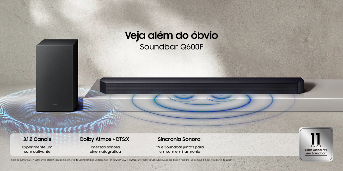 No caso da Soundbar B650F, disponível a partir de 29 de setembro, os usuários vão encontrar uma configuração de 3.1 canais, com um alto-falante central integrado, permitindo diálogos claros em um sistema de som surround completo. O modelo também conta com o Q-Symphony3 para sincronia sonora e com a tecnologia Dolby Audio/DTS Virtual:X9, que cria um som 3D que preenche o ambiente, oferecendo uma sensação de altura, fornecida por meio de técnicas avançadas de processamento de áudio.