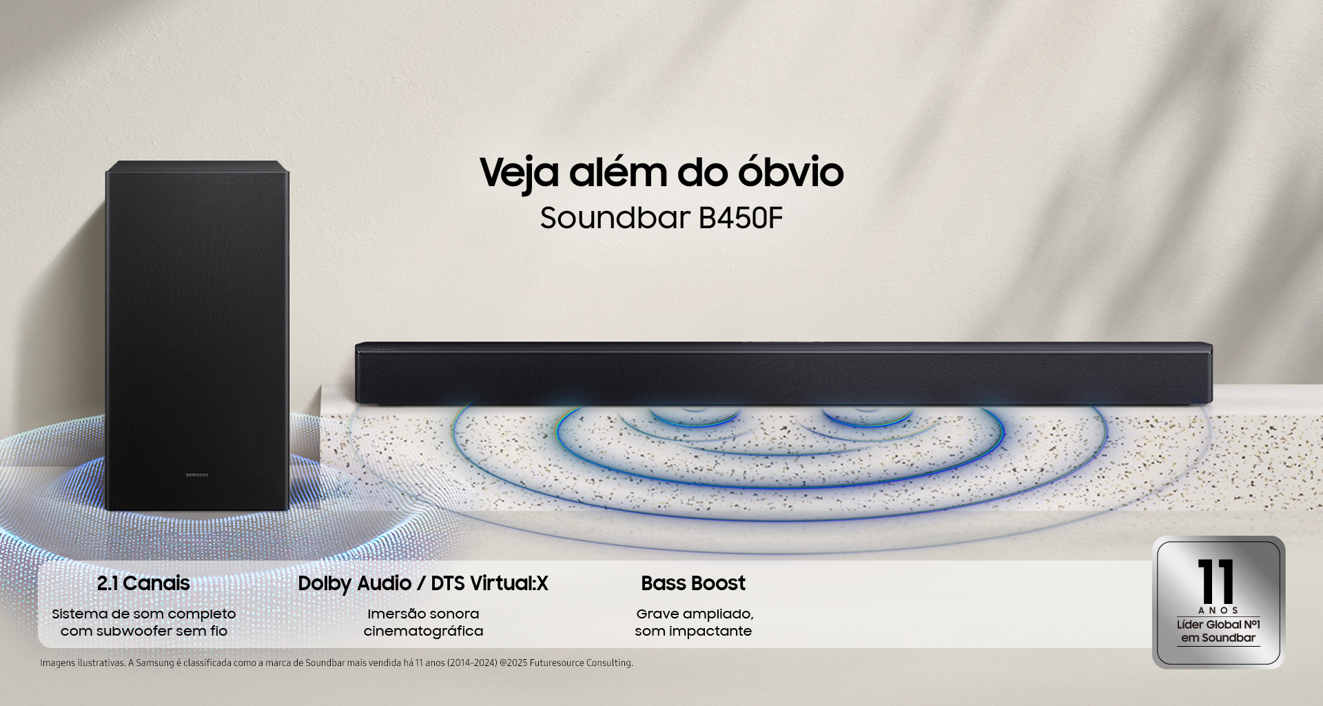 Por fim, a Soundbar B450F traz 2.1 canais, incluindo um subwoofer sem fio, além da tecnologia Dolby Audio/DTS Virtual:X2, permitindo uma experiência de processamento de áudio de última geração. Como destaque do modelo, os usuários terão o Bass Boost, que amplifica frequências mais baixas para dar mais impacto às trilhas sonoras e músicas.