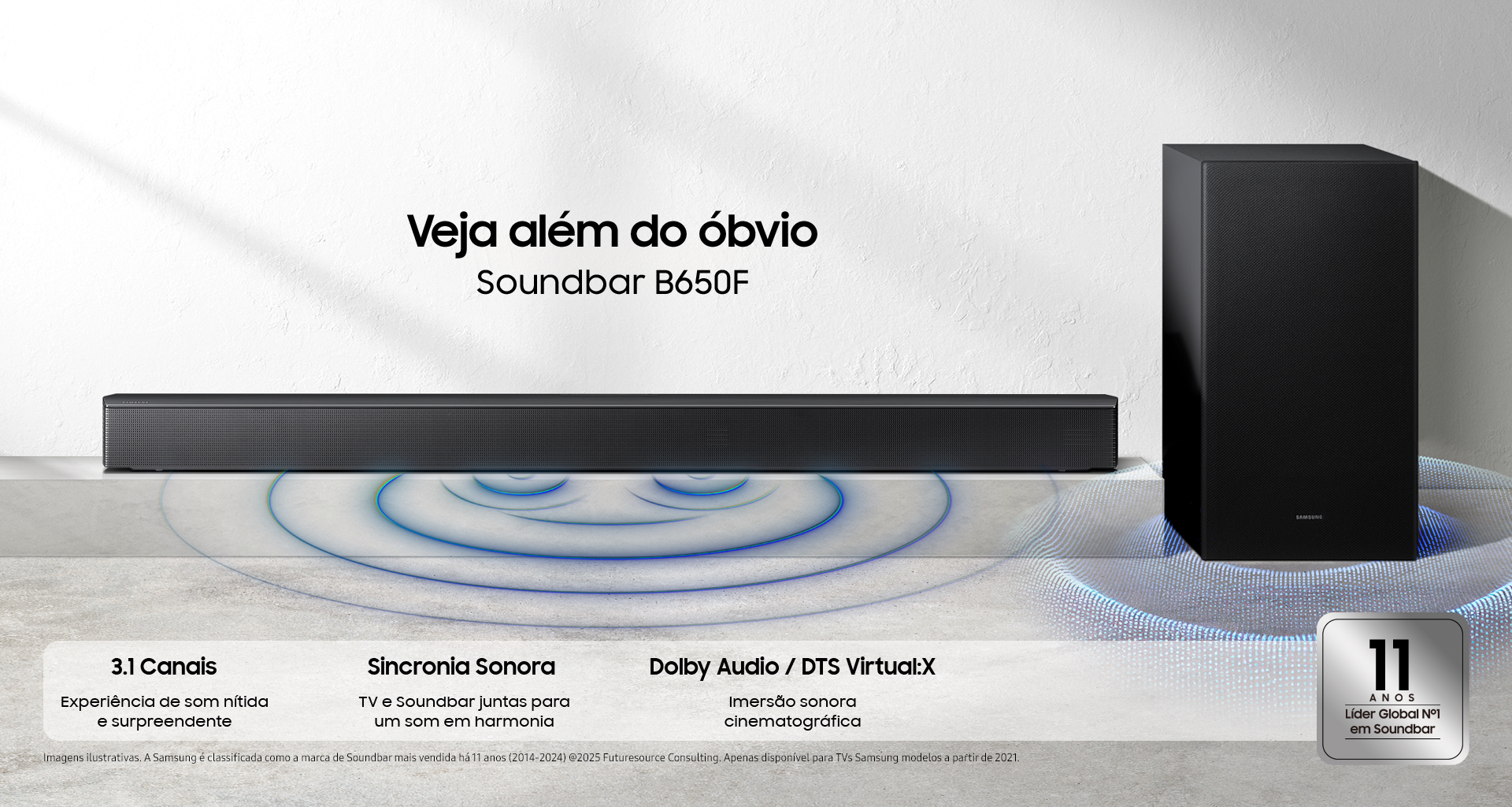 No caso da Soundbar B650F, disponível a partir de 29 de setembro, os usuários vão encontrar uma configuração de 3.1 canais, com um alto-falante central integrado, permitindo diálogos claros em um sistema de som surround completo. O modelo também conta com o Q-Symphony3 para sincronia sonora e com a tecnologia Dolby Audio/DTS Virtual:X9, que cria um som 3D que preenche o ambiente, oferecendo uma sensação de altura, fornecida por meio de técnicas avançadas de processamento de áudio.