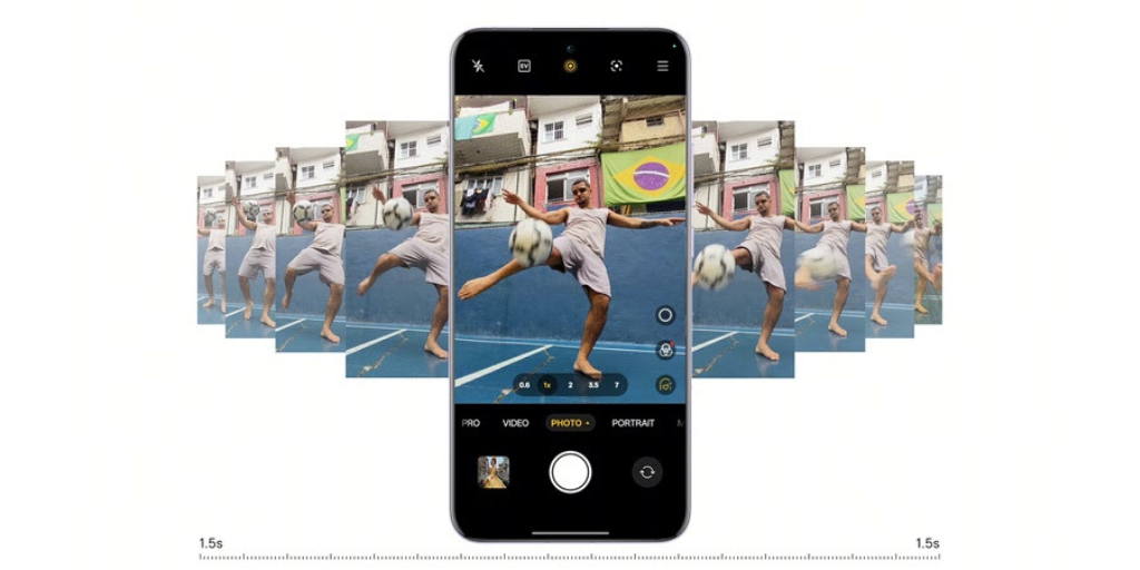 Já a função AI Livephoto grava automaticamente 1,5 segundo antes e depois de cada clique, garantindo que nenhum momento espontâneo seja perdido. A tecnologia ainda oferece estabilização eletrônica e resolução de saída em 1.7K, mesmo após recortes automáticos.