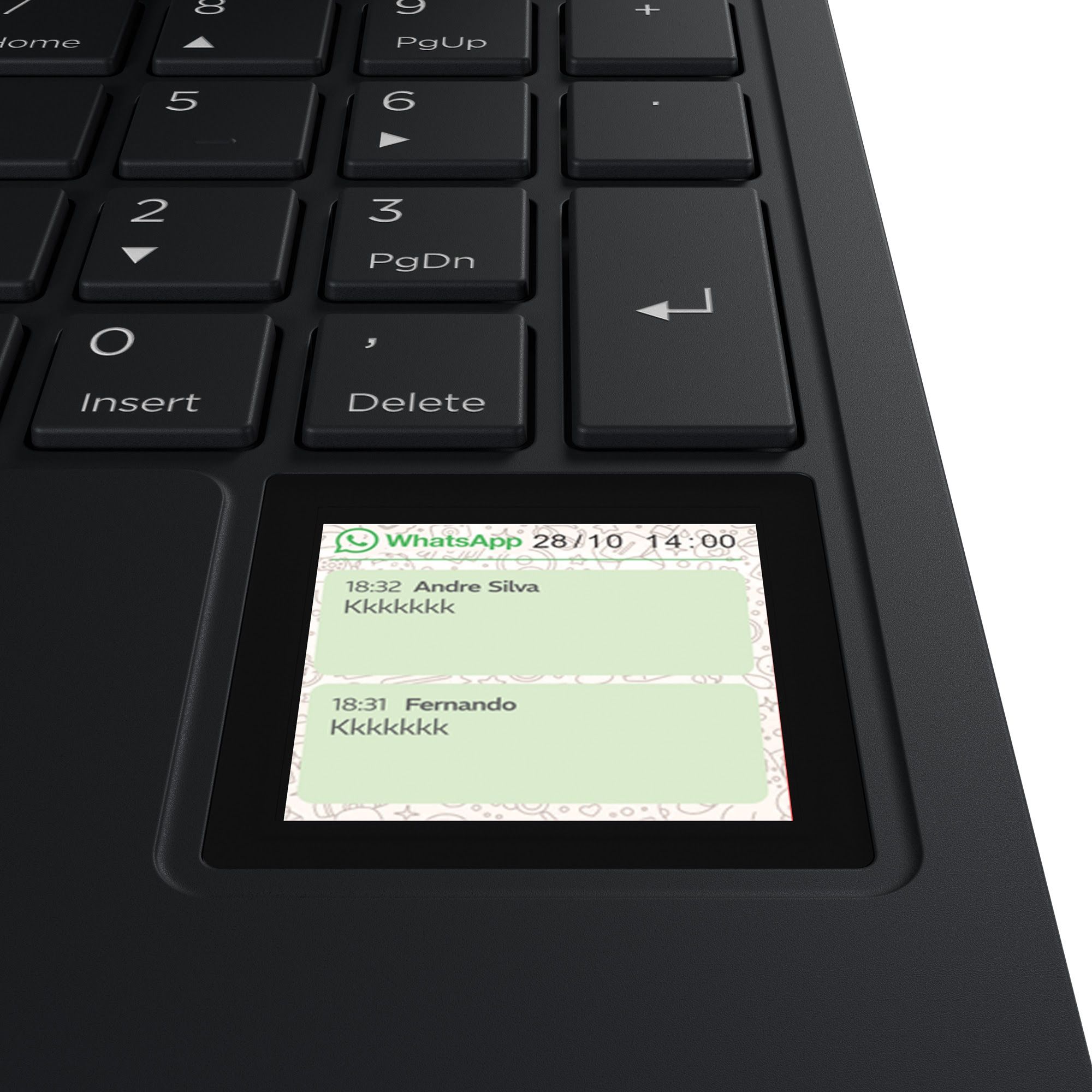 Entre as funcionalidades mais práticas do novo notebook está a possibilidade de receber notificações do WhatsApp diretamente na Minitela, o que torna o recurso ideal para acompanhar mensagens importantes em tempo real, sem precisar alternar de janela ou interromper o trabalho. Além disso, o software proprietário da Positivo permite configurá-la para exibir previsão do tempo, lembretes pessoais, status do dispositivo (bateria, rede, conexões), além de fotos e GIFs. O controle é feito de forma prática por meio de uma tecla dedicada, que permite navegar pelas páginas da Minitela com agilidade.