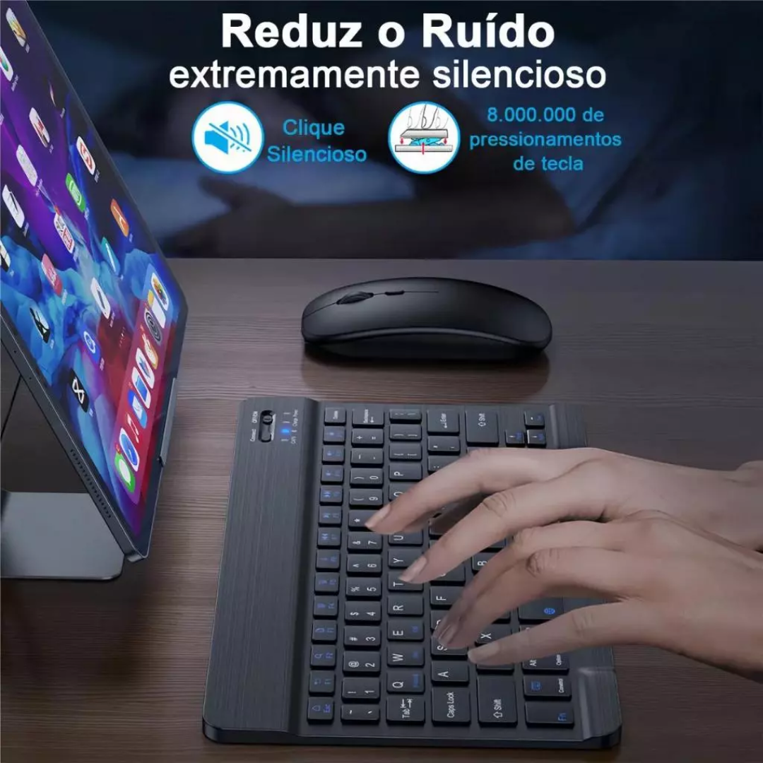 Bateria de Longa Duração: Esqueça as pilhas! O teclado possui bateria de lítio de 150 mAh, que entrega um incrível tempo de uso de até 100 dias (calculado para 8 horas de uso diário) com apenas 2 horas de carregamento.