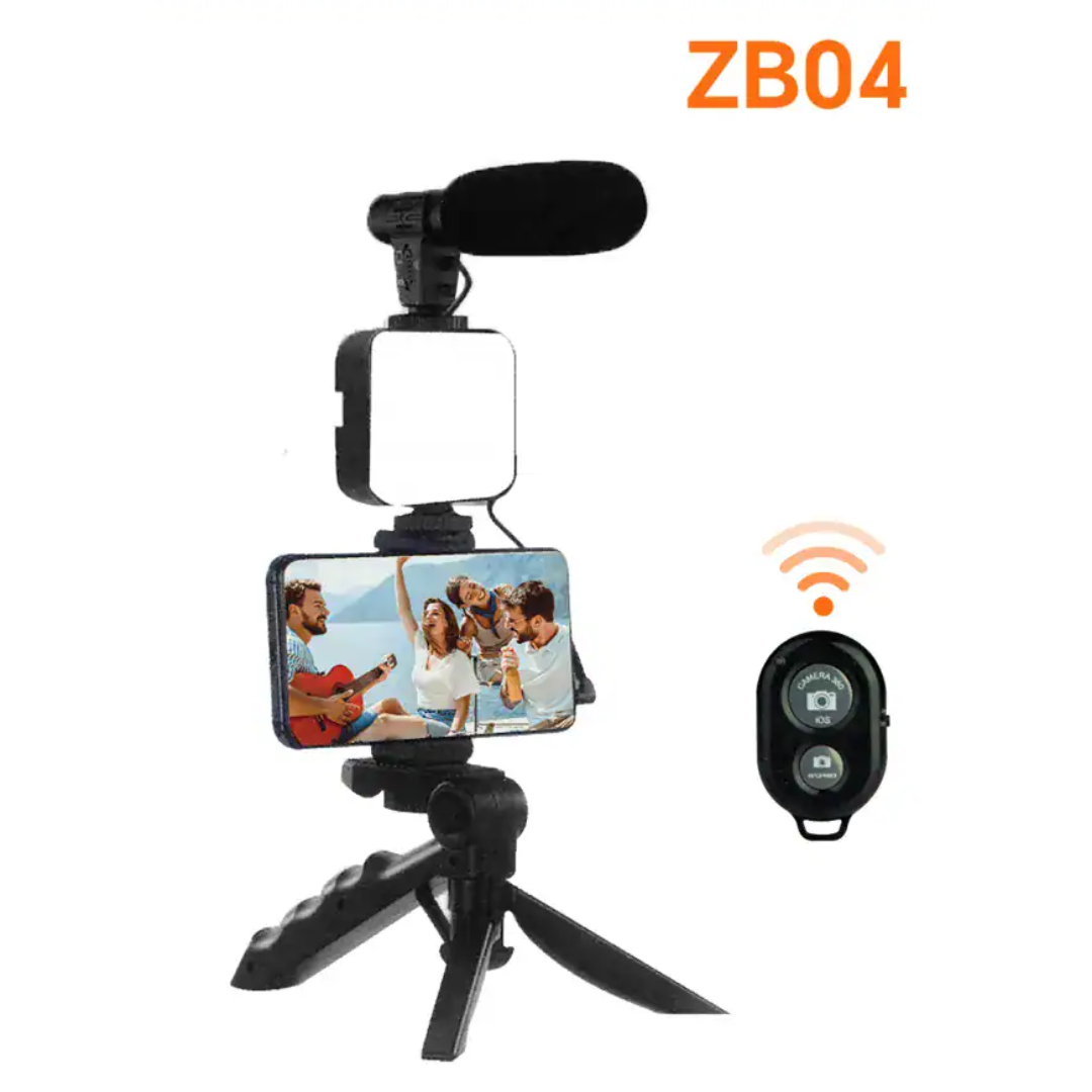 Tudo em um só lugar: Esqueça a complicação de comprar e montar vários equipamentos separados. O ZB04 une suporte, luz, áudio e controle em um design inteligente.