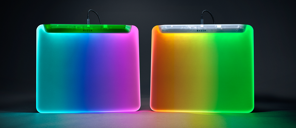 Mousepad RGB com superfície translúcida que exibe a circuitaria e amplia o efeito de luz no setup.