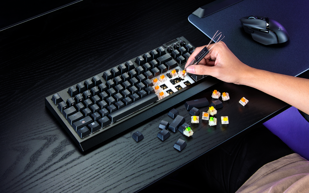 O BlackWidow V4 TKL HyperSpeed vem equipado com os switches mecânicos Razer Orange Tactile de terceira geração, além de ser compatível com switches de 3 e 5 pinos, permitindo ao usuário personalizar o som e o toque de cada tecla. A construção interna inclui: