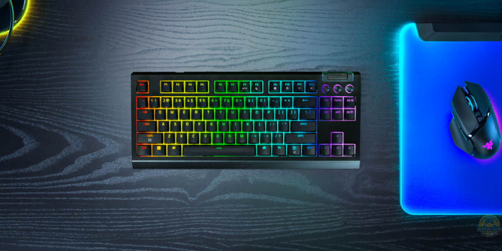 O teclado conta com um controle giratório multifuncional e três botões dedicados, que podem ser configurados via Razer Synapse para funções como controle de mídia, volume e status da bateria. A personalização permite adaptar o periférico ao estilo de jogo de cada usuário.