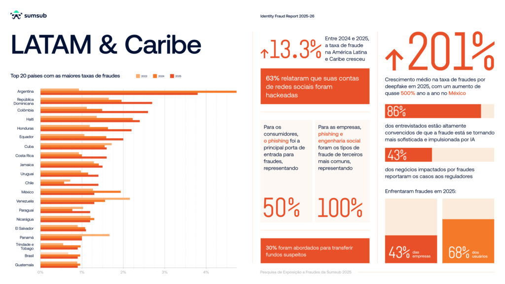 - Impacto nas empresas: Na região, 43% das empresas sofreram fraude em 2025, 100% das afetadas foram alvo de phishing e apenas 43% relataram fraude de identidade às autoridades;