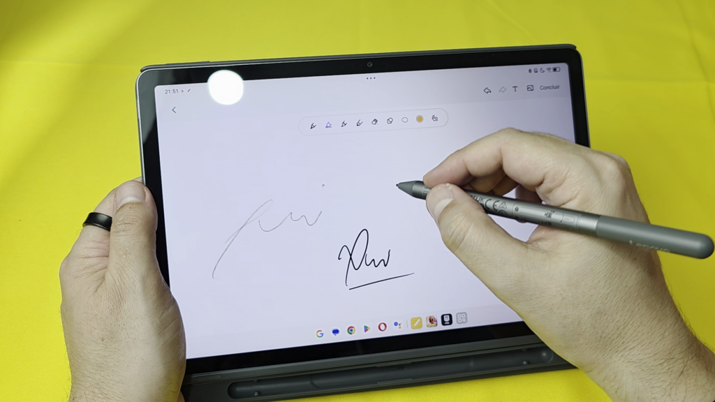 A escrita em si é fluida e conta com a tecnologia de Palm Rejection (rejeição de palma), permitindo apoiar a mão na tela sem falhas. O tablet já integra recursos de Inteligência Artificial para produtividade: