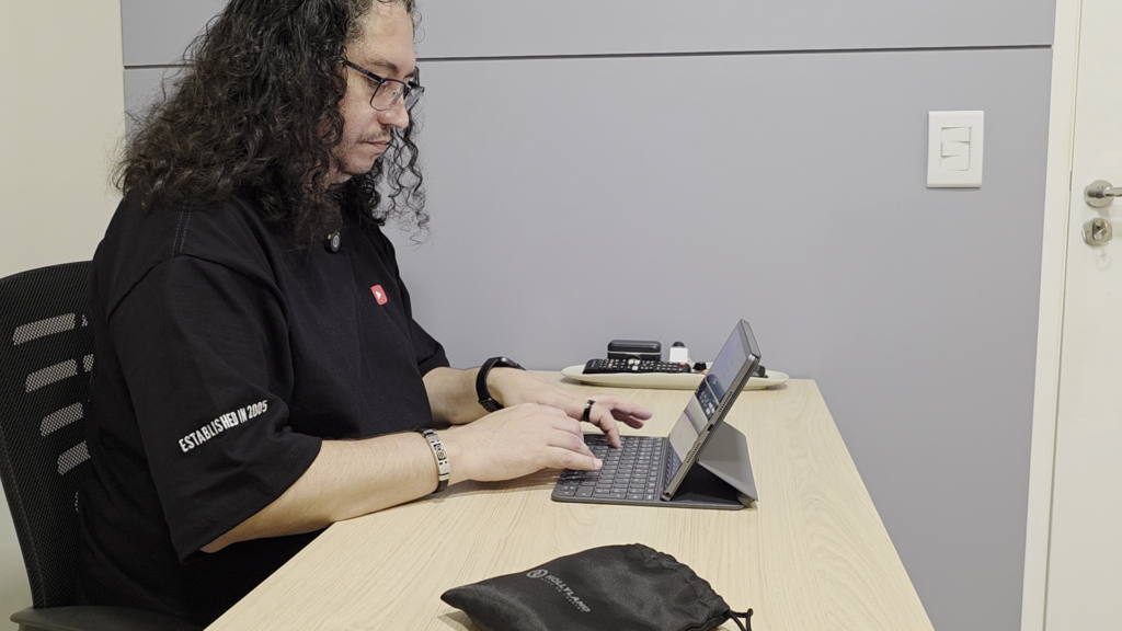 No caso deste modelo nacional, tivemos uma grata surpresa: o teclado segue o padrão ABNT2. Confirmamos em nossos testes a presença da tecla “Ç” física, o que é essencial para brasileiros que escrevem roteiros ou trabalhos acadêmicos. A conexão via pinos magnéticos (Pogo Pins) elimina a necessidade de pareamento Bluetooth e de carregar o teclado separadamente, já que ele puxa energia direto do tablet.