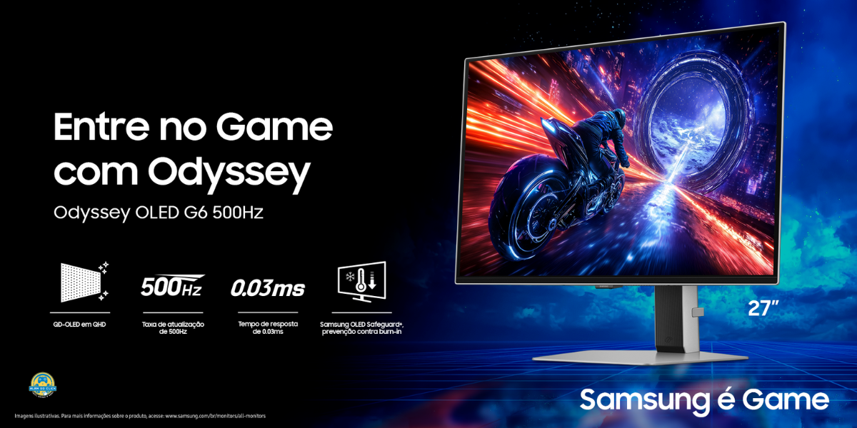 A Samsung anuncia a chegada, no mercado brasileiro, do Odyssey OLED G6 500Hz, o primeiro monitor OLED de 500Hz do mundo*. A novidade reforça o já extenso portfólio gamer da marca, que lidera há seis anos consecutivos o mercado global de monitores gamer, e por dois anos consecutivos de telas OLED para jogos1, O novo Odyssey OLED G6 500Hz oferece um display inovador, que eleva o desempenho dos jogos, a qualidade visual e a imersão a novos patamares.