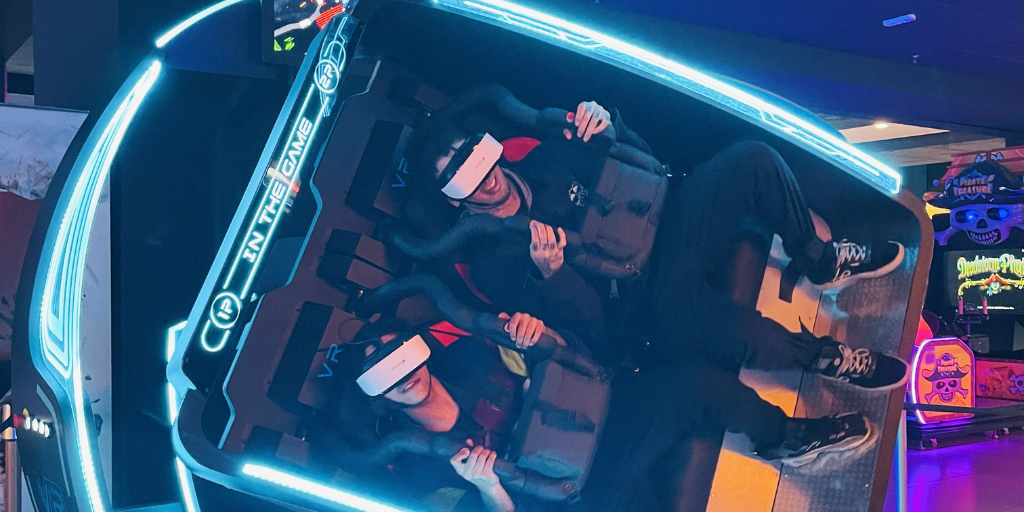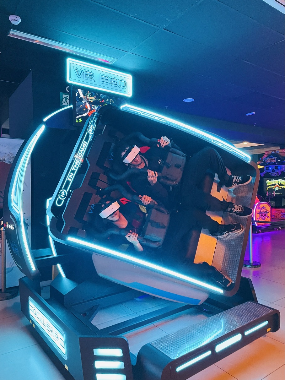 Com design futurista em forma de cápsula, o simulador traz cadeiras em formato de ovo, sistema de som surround e movimentos que acompanham o conteúdo exibido nos óculos de realidade virtual. São mais de 40 opções de jogos, como montanhas-russas, aventuras de terror e corridas. A experiência comporta dois participantes por vez, com foco em conforto acústico e alta imersão.