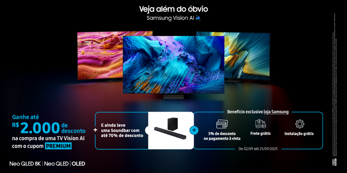 Até 21 de setembro, quem adquirir uma Neo QLED 8K, Neo QLED ou OLED da linha 2025, ganha até R$ 2 mil de desconto. Para isso, basta adicionar o cupom PREMIUM, exclusivo da loja Samsung, na hora da compra. Outros benefícios incluem frete e instalação gratuitas para os usuários.